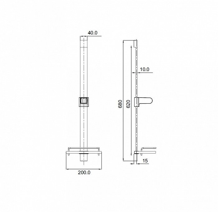 Стойка для душа. Комплектация: полка, держатель лейки, крепления. Материал: нержавеющая сталь. Высота стойки: 68 см, сечение прямоугольное