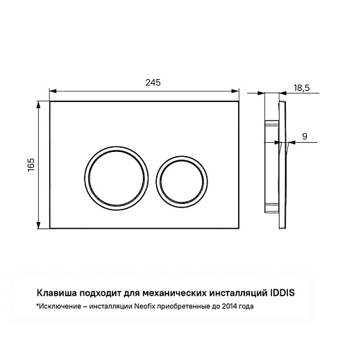 Белая клавиша IDDIS® Unifix составит базовый комплект с подвесной сантехникой – подходит ко всем механическим инсталляциям IDDIS®, кроме инсталляции Neofix в модификации, продававшейся до 2014 года (см. на фото). Хромированный контур круглых кнопок выступает ярким акцентом, превращая функциональный продукт в стильный аксессуар. Плоская и эстетичная клавиша смыва займет пространство размером не более ежедневника (24,5 на 16,5 см). Она легко монтируется и снимается для удобного доступа к крану открытия-закрытия воды и обслуживания арматуры. Модель представлена в нескольких цветовых сочетаниях.