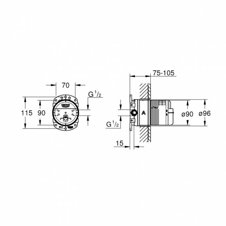 Встраиваемая часть оснащена двумя входами 1/2", что обеспечивает гибкость подключения в различных вариантах монтажа. Монтажная глубина составляет 75–105 мм, позволяя адаптировать установку под различные строительные условия