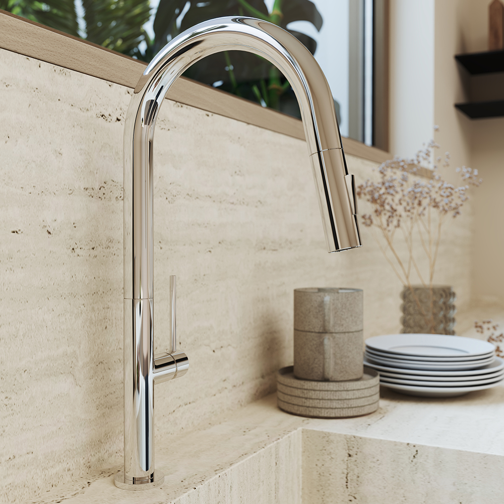 - Смеситель с выдвижным изливом удобен для мытья крупной посуды, мойки и наполнения емкостей