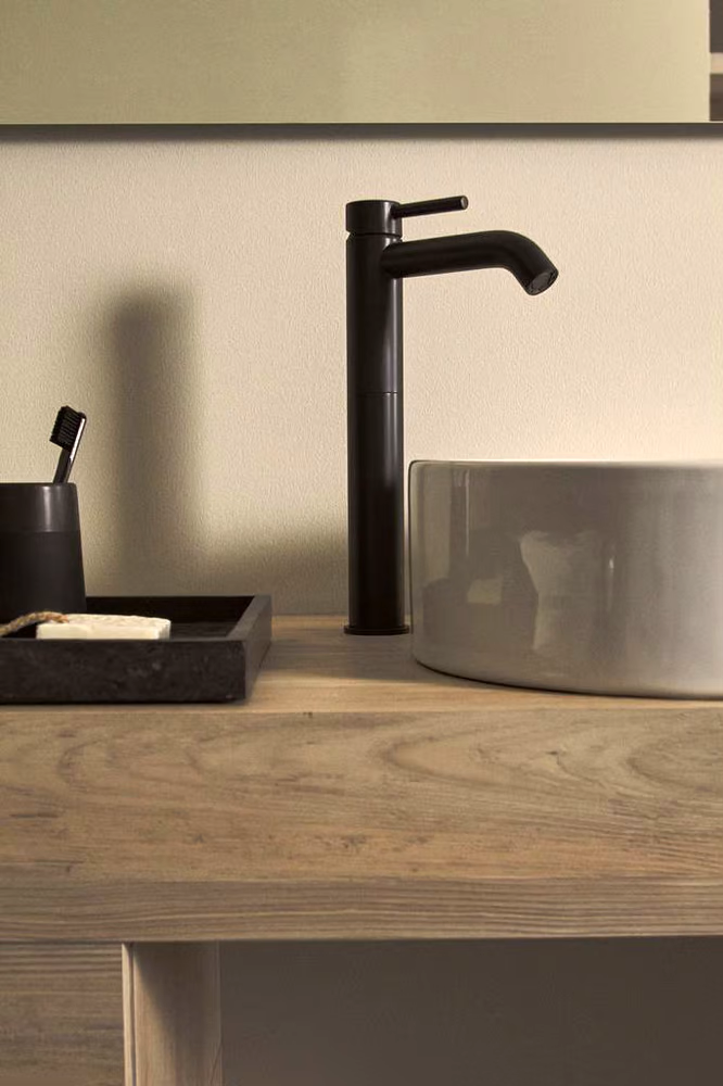 Однорукоятковый смеситель для умывальника CERALINE Vessel с удлиненным корпусом, картридж 35 мм Firmaflow® с функцией HWTC (ограничение максимальной температуры горячей воды).